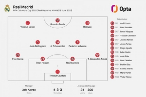 皇马首发:1-库尔图瓦、20-弗兰-加西亚、24-怀森、35-劳尔-阿森西奥、12-阿诺德、5-贝林厄姆、8-巴尔韦德、14-琼阿梅尼、7-维尼修斯、11-罗德里戈、30-贡萨洛-加西亚
