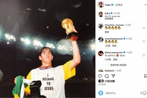 卡卡2002年随巴西队问鼎世界杯,他在社交媒体上晒出自己举起大力神杯的照片,配文:“23年前。”