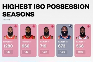 17-18赛季,哈登单打719次