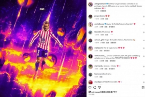 本场比赛格列兹曼打进一球,达成马竞生涯200粒进球里程碑。赛后他也在个人社媒晒出海报,写道:“身披这件球衣庆祝进球是一种荣幸,而能够200次做到这一点则是梦想成真。感谢所有球迷!”