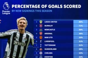 英超各队新援进球占球队总进球比例:利兹联86%最高,阿森纳第4