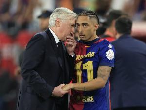 报道称,据了解拉菲尼亚周四训练课后感到不适,周五则是完全没有参与训练,拉菲尼亚将确定无缘国家德比。弗里克虽然此前并不打算让他首发,但本计划让拉菲尼亚出任替补奇兵的角色。